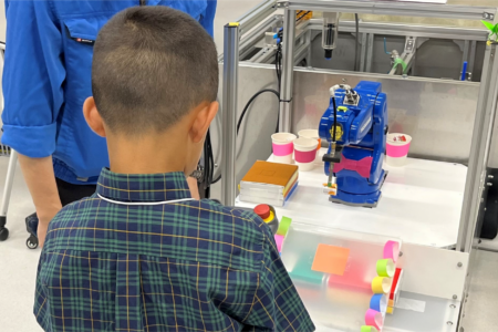 工場ではたらく「産業用ロボット」に動きを教えて、自動運転させてみよう! 指示通りなめらかに動く姿に、大人も子どもも釘付けです!