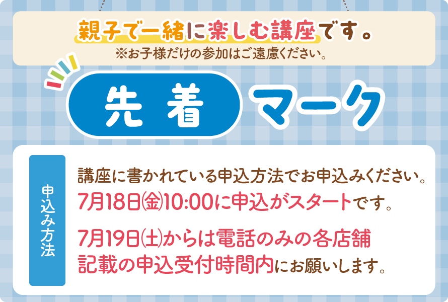 ※申込方法は各店舗によって異なります。詳しくは各講座の内容をご確認ください。 ※電話での申込は各店の受付時間内にお願いします。 ※申込初日は、電話回線の混雑が予想されます。ご了承ください。※ホームページより申込の場合は予約から1週間以内に連絡がきます。連絡がない場合はお店へ直接お問い合わせください。